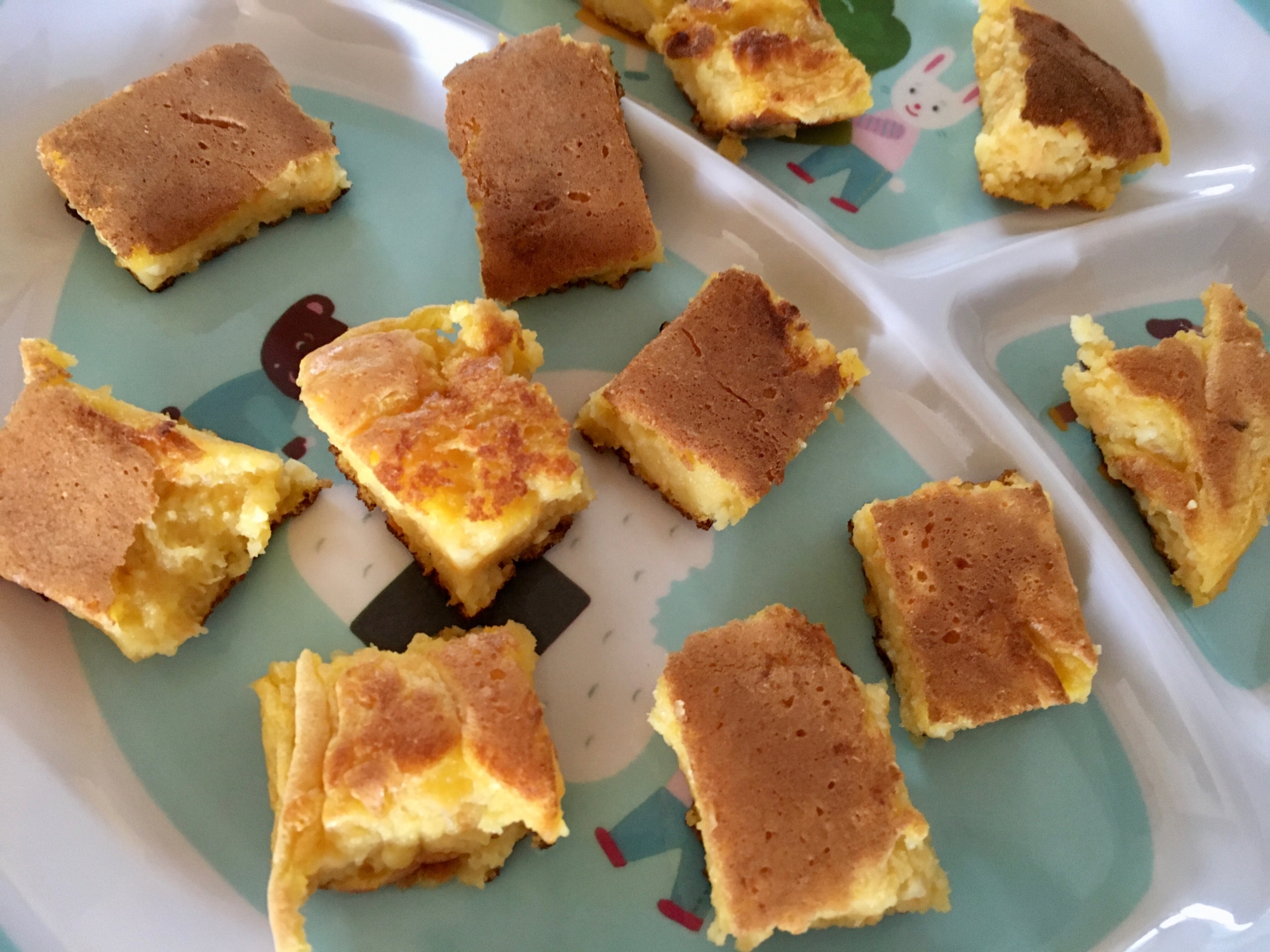 離乳食完了期 幼児食 ホットケーキミックスで作る簡単おやつ 卵なしでふんわり食感 朝ごはんや持ち運びおやつとしてもおすすめです 表面のチーズが香ばしくカリッと仕上がります レシピ 離乳食 手づかみ レシピ 幼児食 レシピ